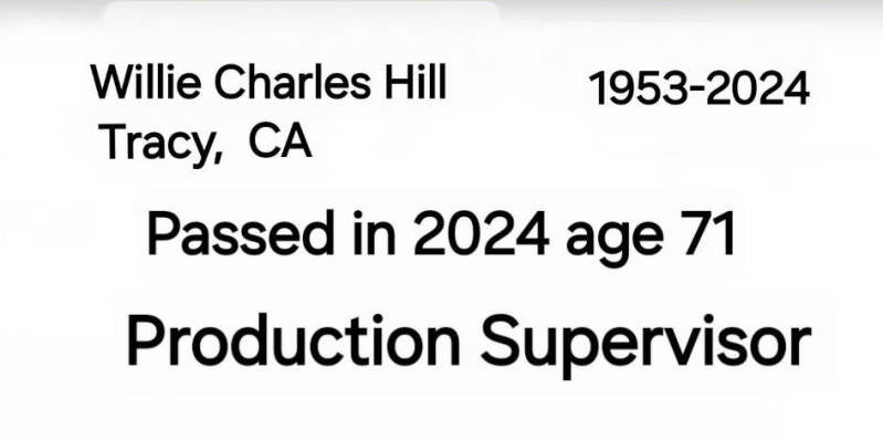 Willie Charles Hill Jr., 71, passed away on Tuesday, March 19, 2024. He was born in Napes, Texas on March 9, 1953. He has resided in Tracy for the past 22 years with his wife, Beverly M. Norris.